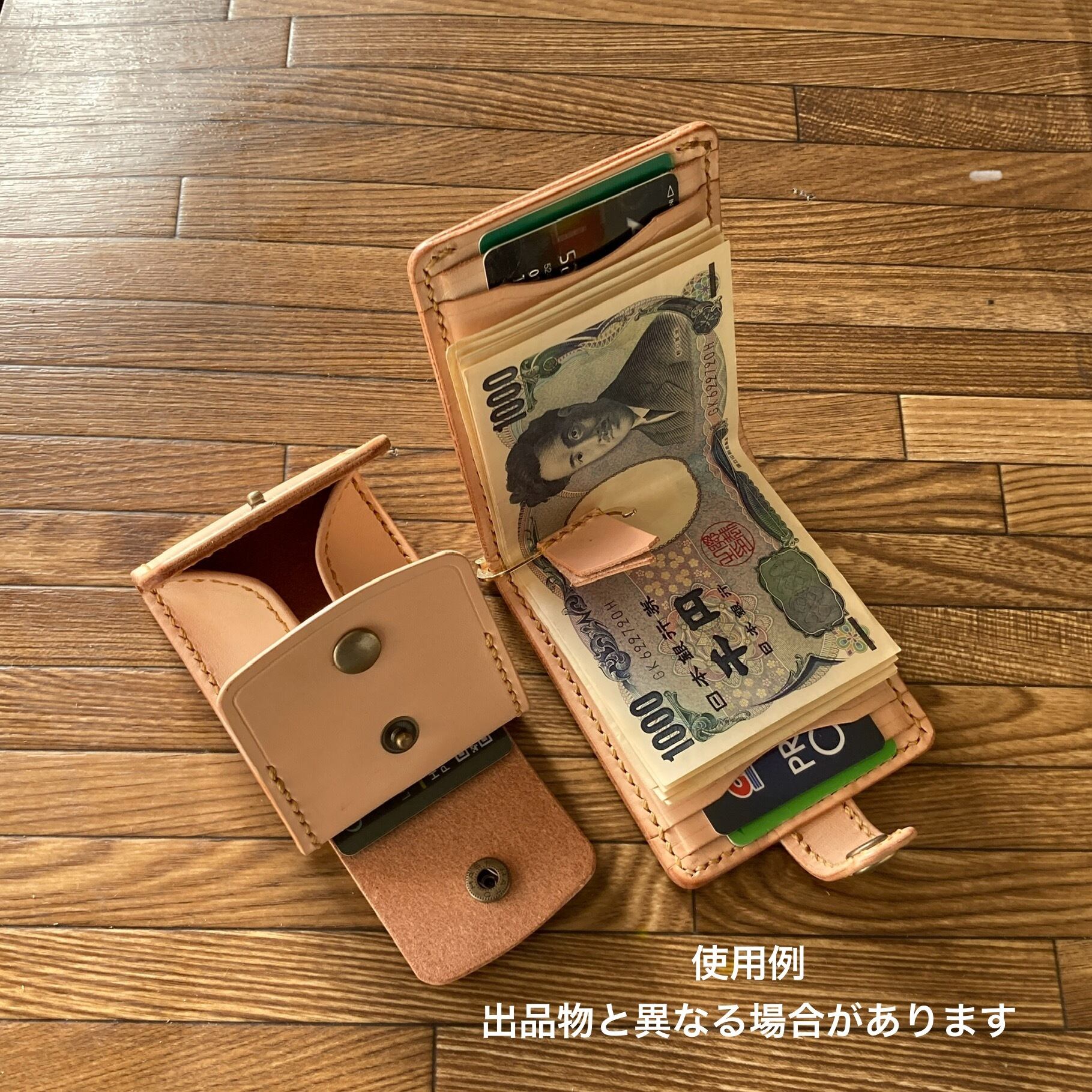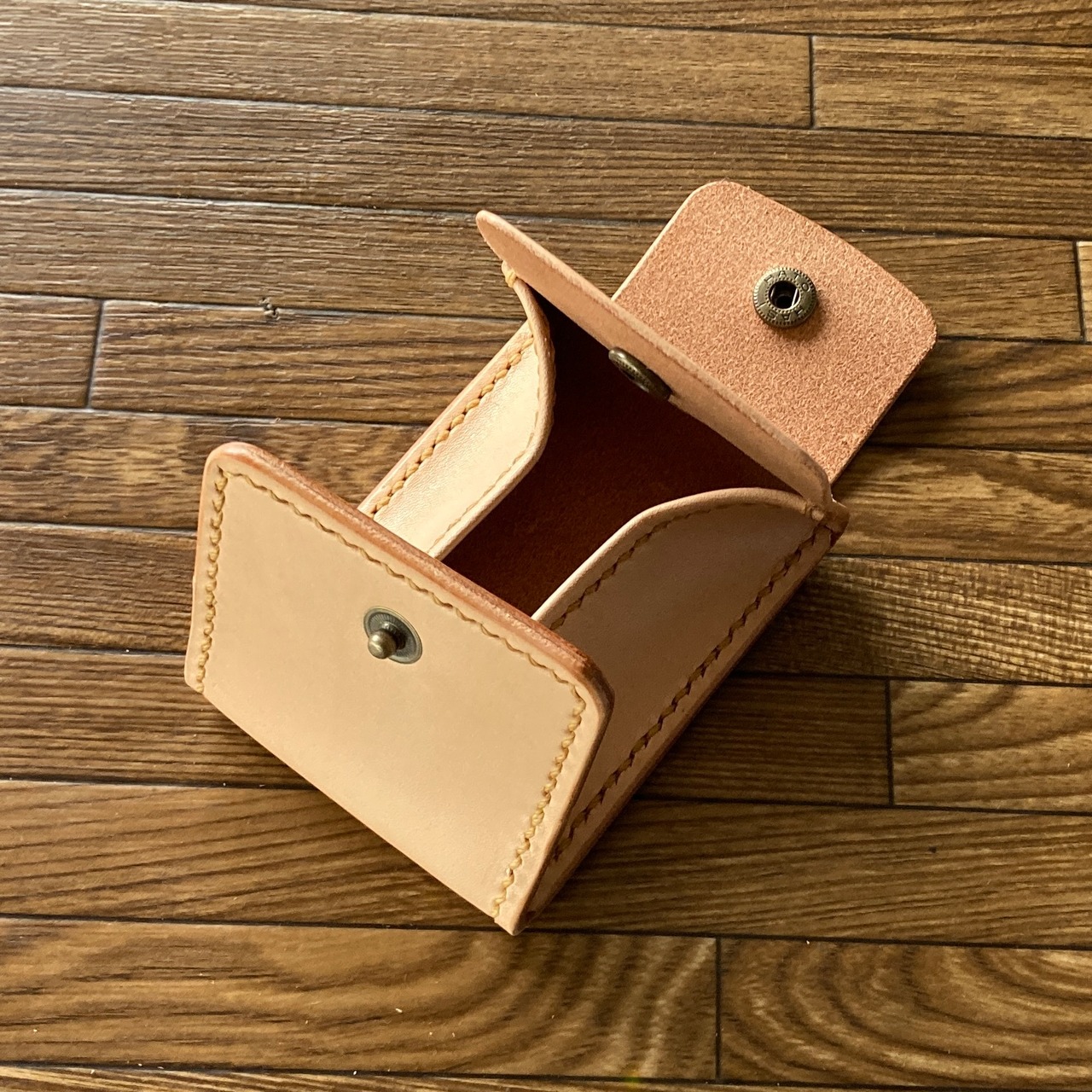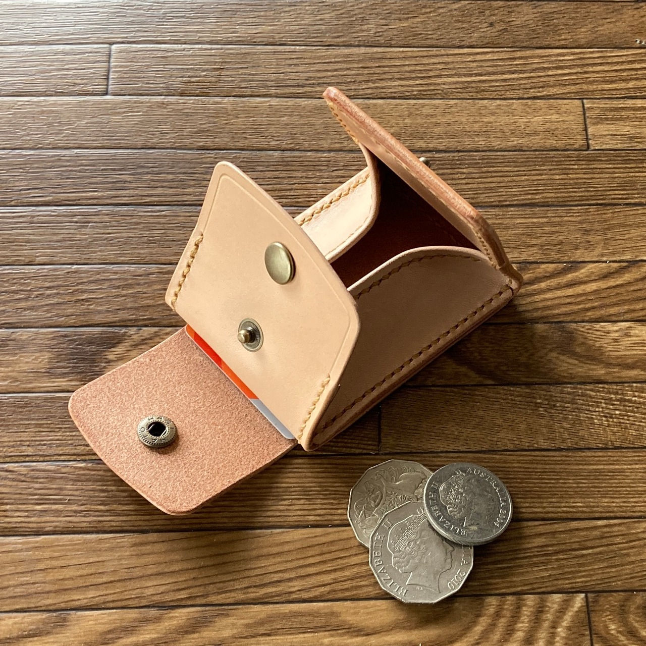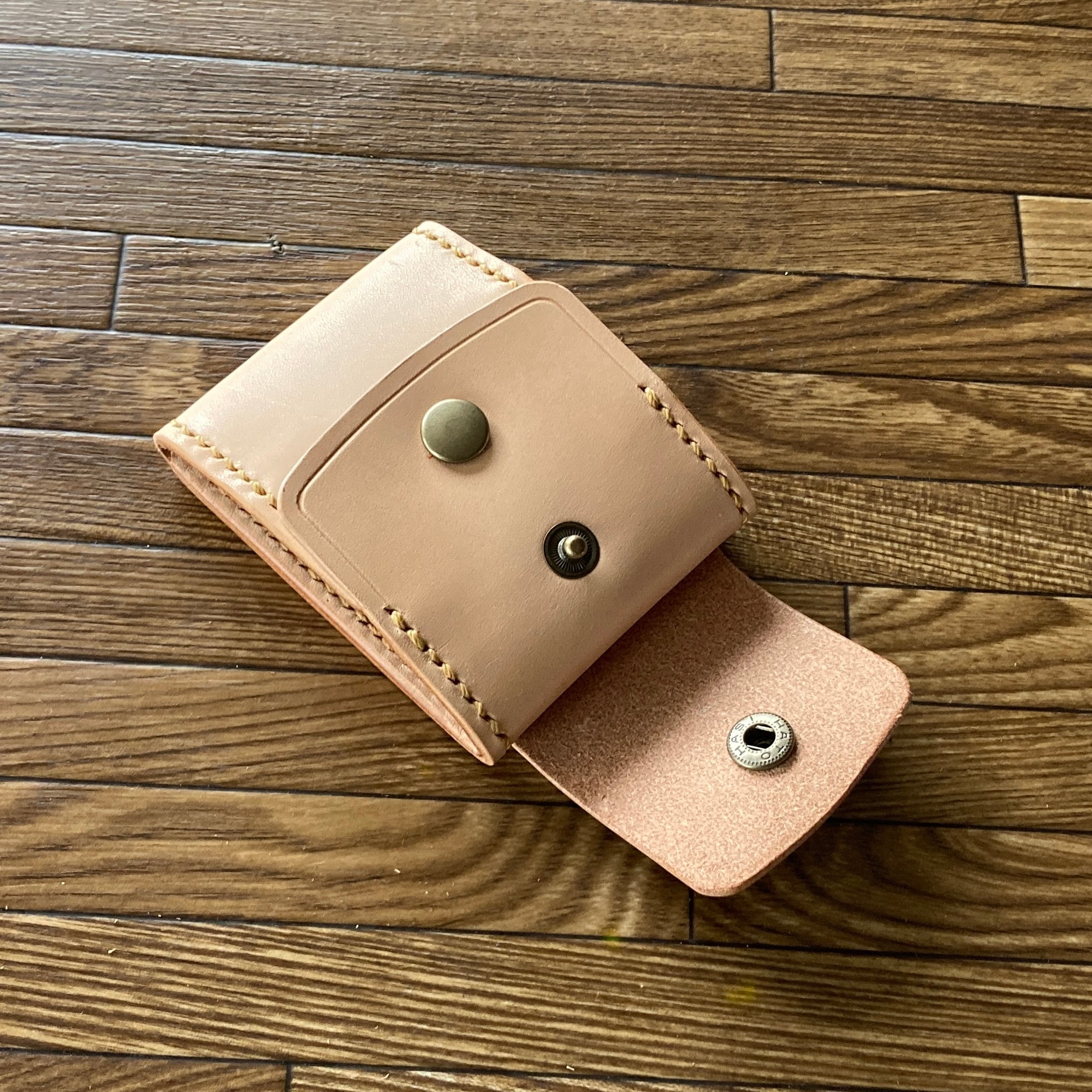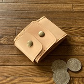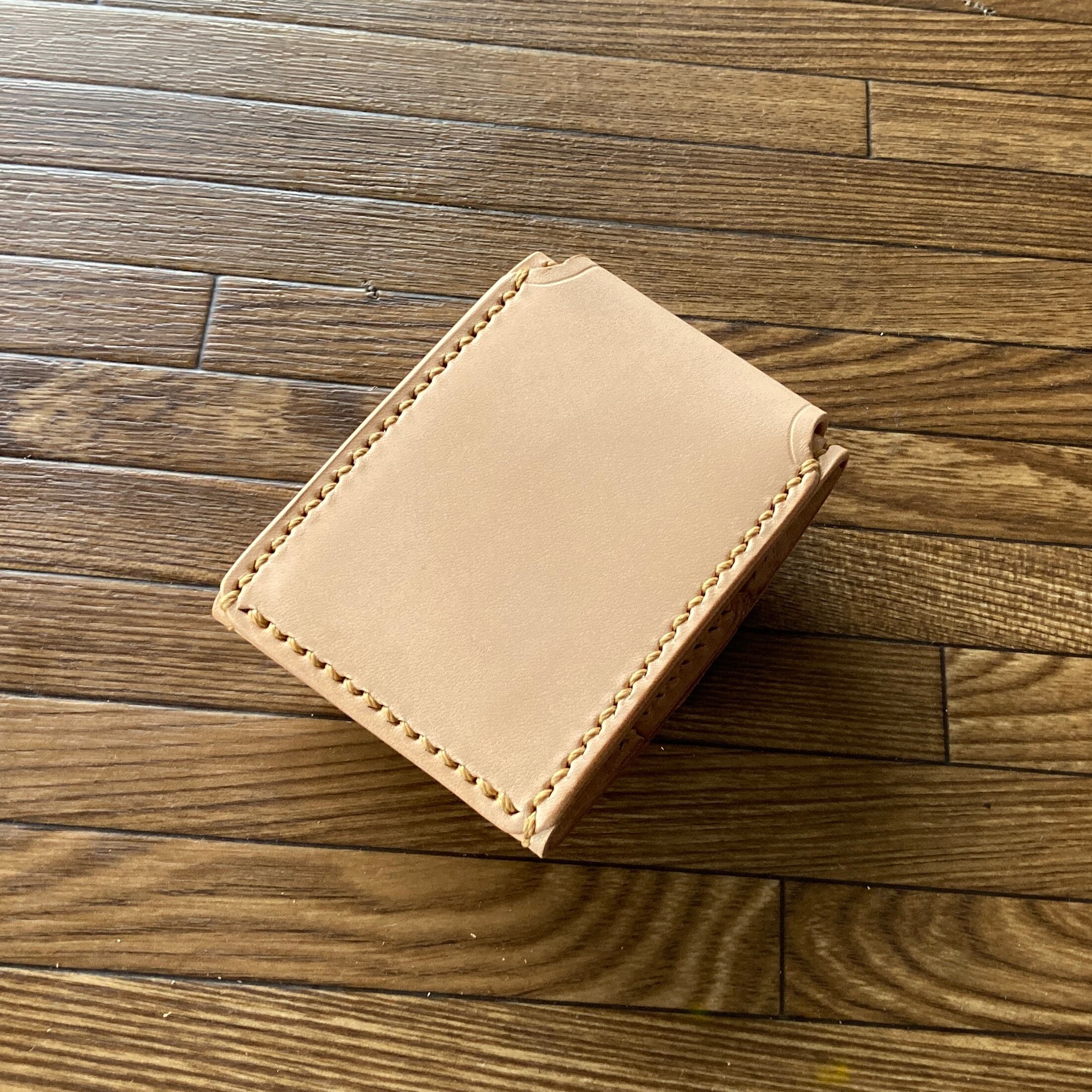コインが簡単に取り出せるように、部分的に1mm前後の薄いヌメ革を使い柔らかさを出し、強度アップのための折り返し部は、剥がれないように縫い上げています。カードも入る大きさです。