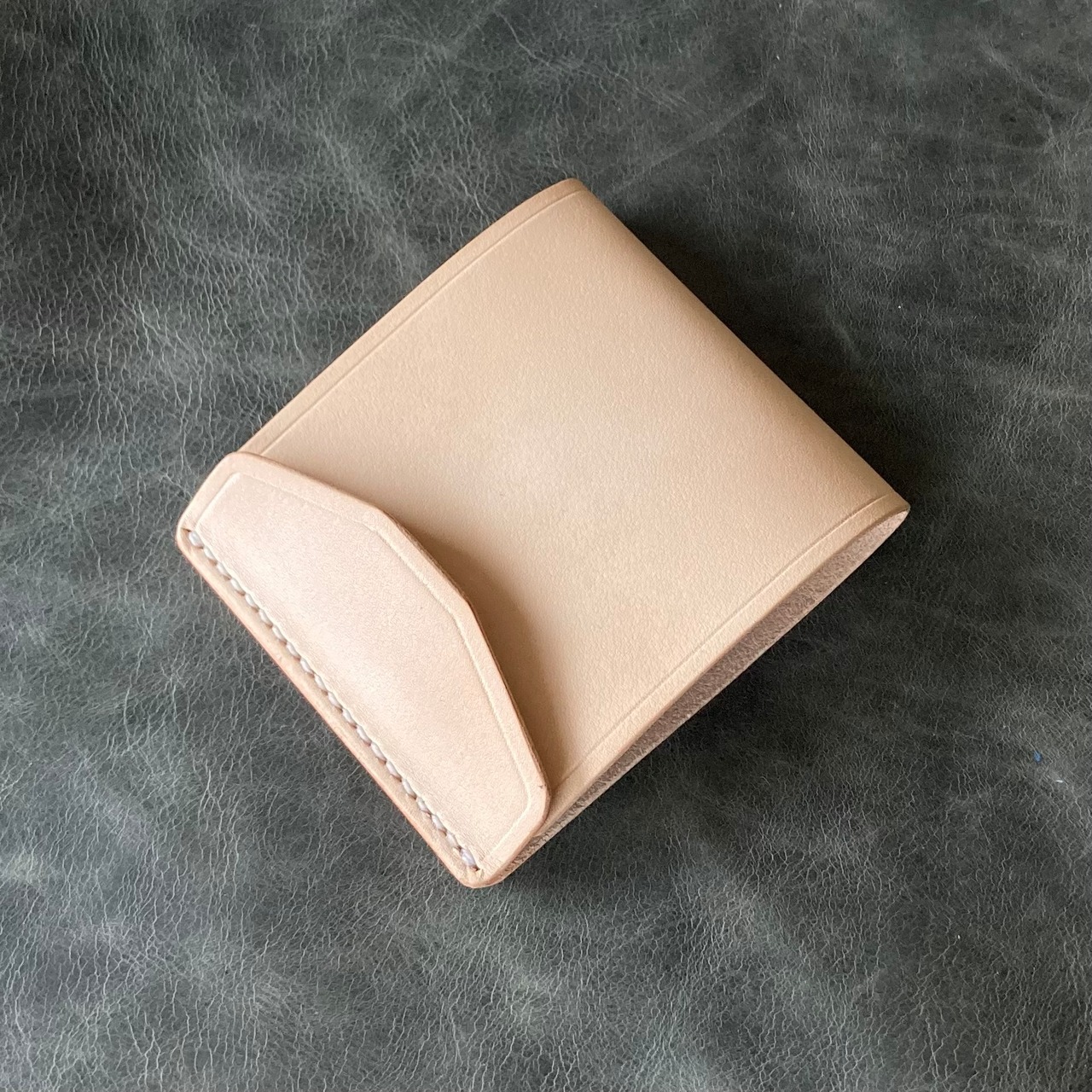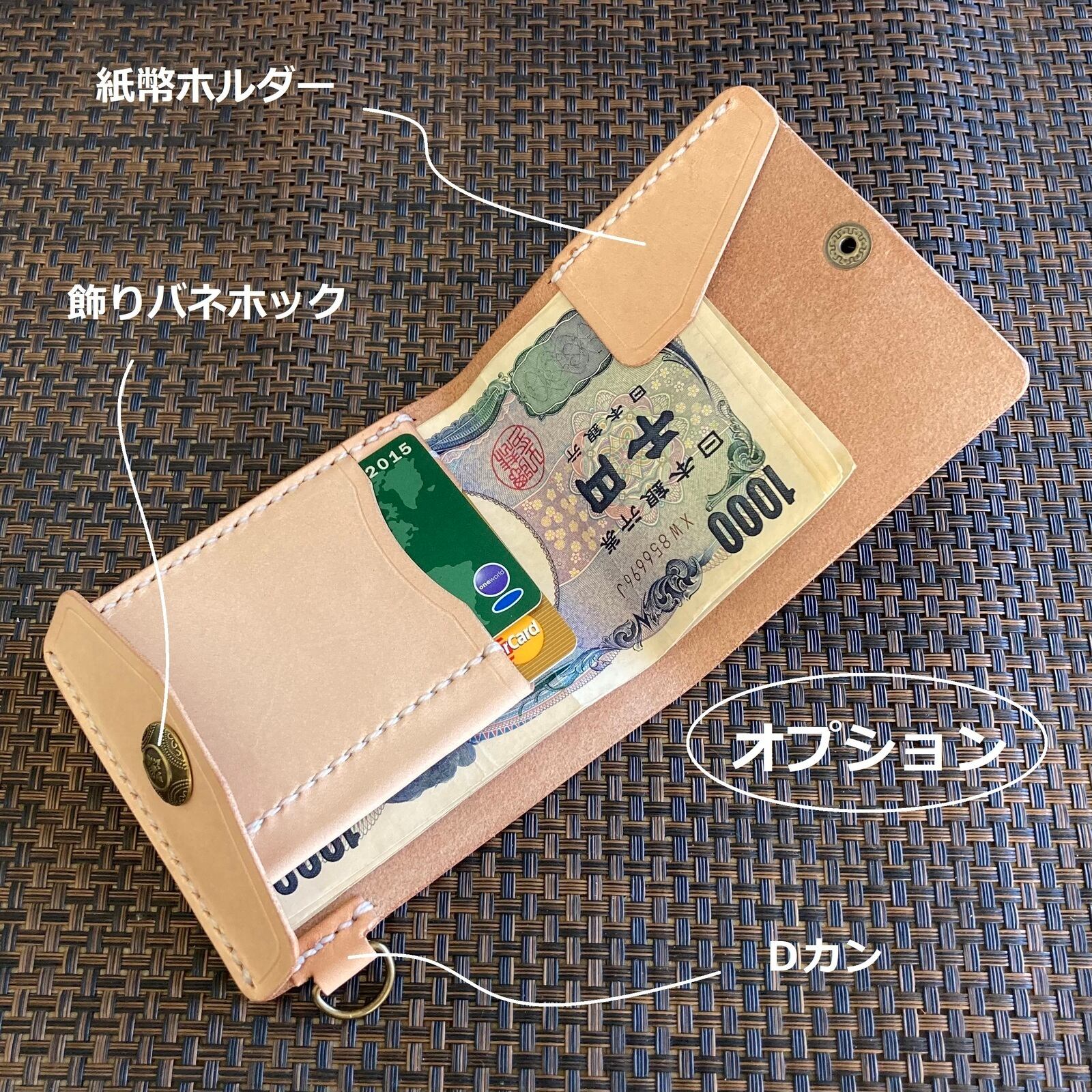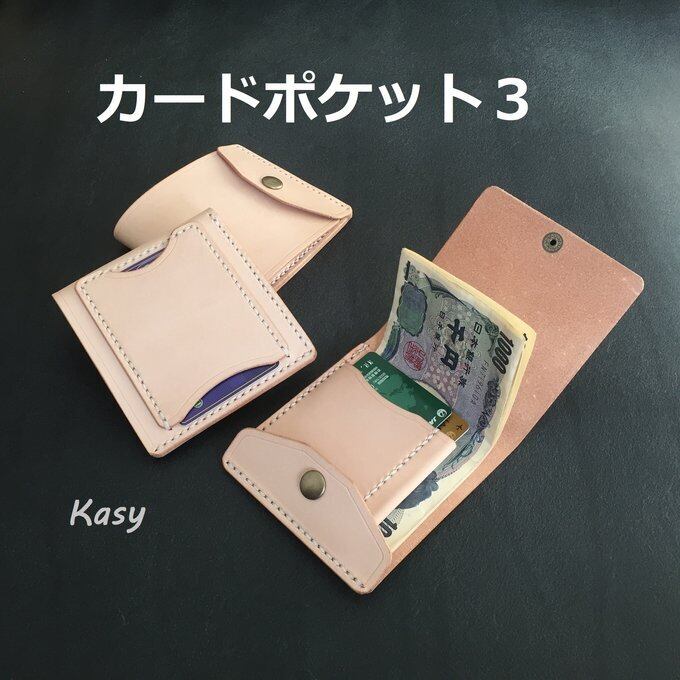 お札を挟んでいるカードポケットは一辺だけ縫い付けてありますので、お札を入れるときに開けることができます。端は斜めにカットしていますので、カードの端をつまんで出すことができます。